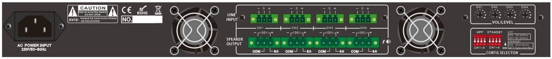 이득 제어와 각각 채널을 위한 피닉스 연결기에 의한 4 평형입력이 있습니다. 네개의 분리된 지대 스피커는 100V와 4 오옴에 의해 둘다 출력합니다. 짜맞춘 4 채널 분리된 고주파 려파기는 감광 스위치 프리 세팅을 통하여 가능해지거나 무력하게 됩니다.